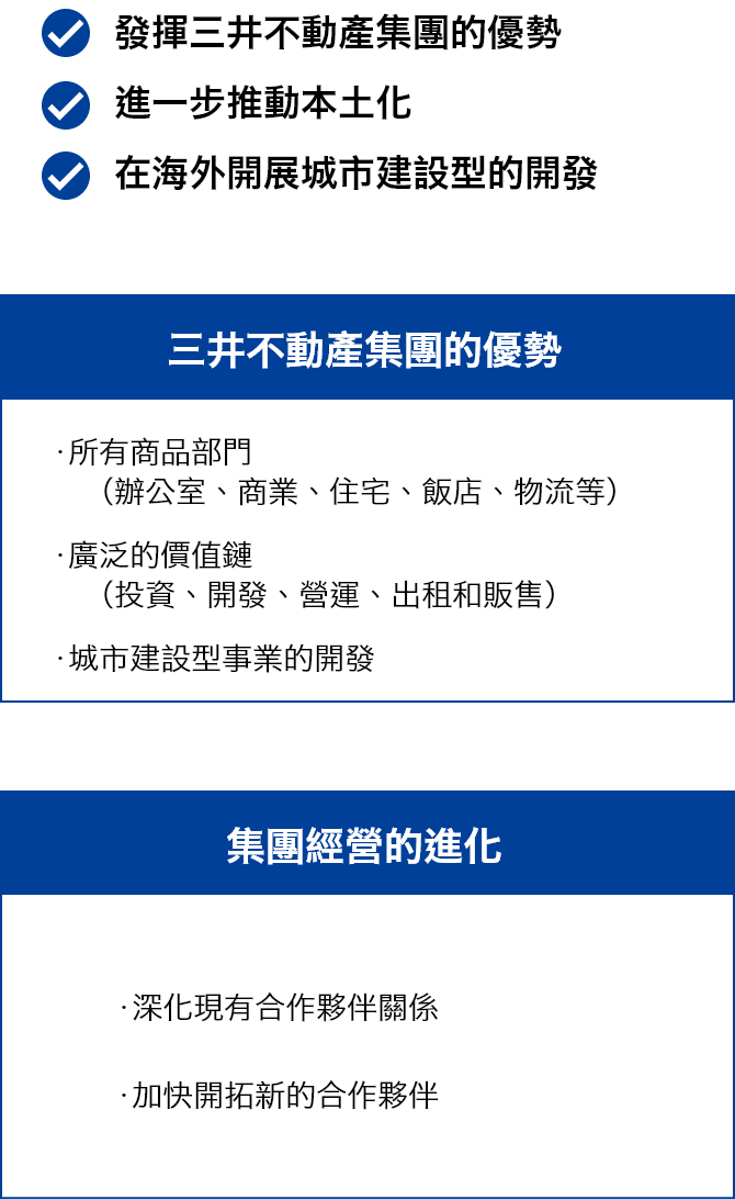 我們的目標是,發揮作為綜合開發商的優勢與精通各國市場的合作夥伴的優勢的相乘效應,致力於新的開發事業,同時實現飛躍式的發展。
