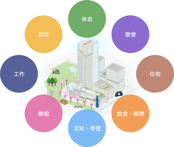 營造人們匯聚的「場所」,創造出「繁華熱鬧」和新「事物」。三井不動產竭力於展望未來的「經年優化」的城市建設。